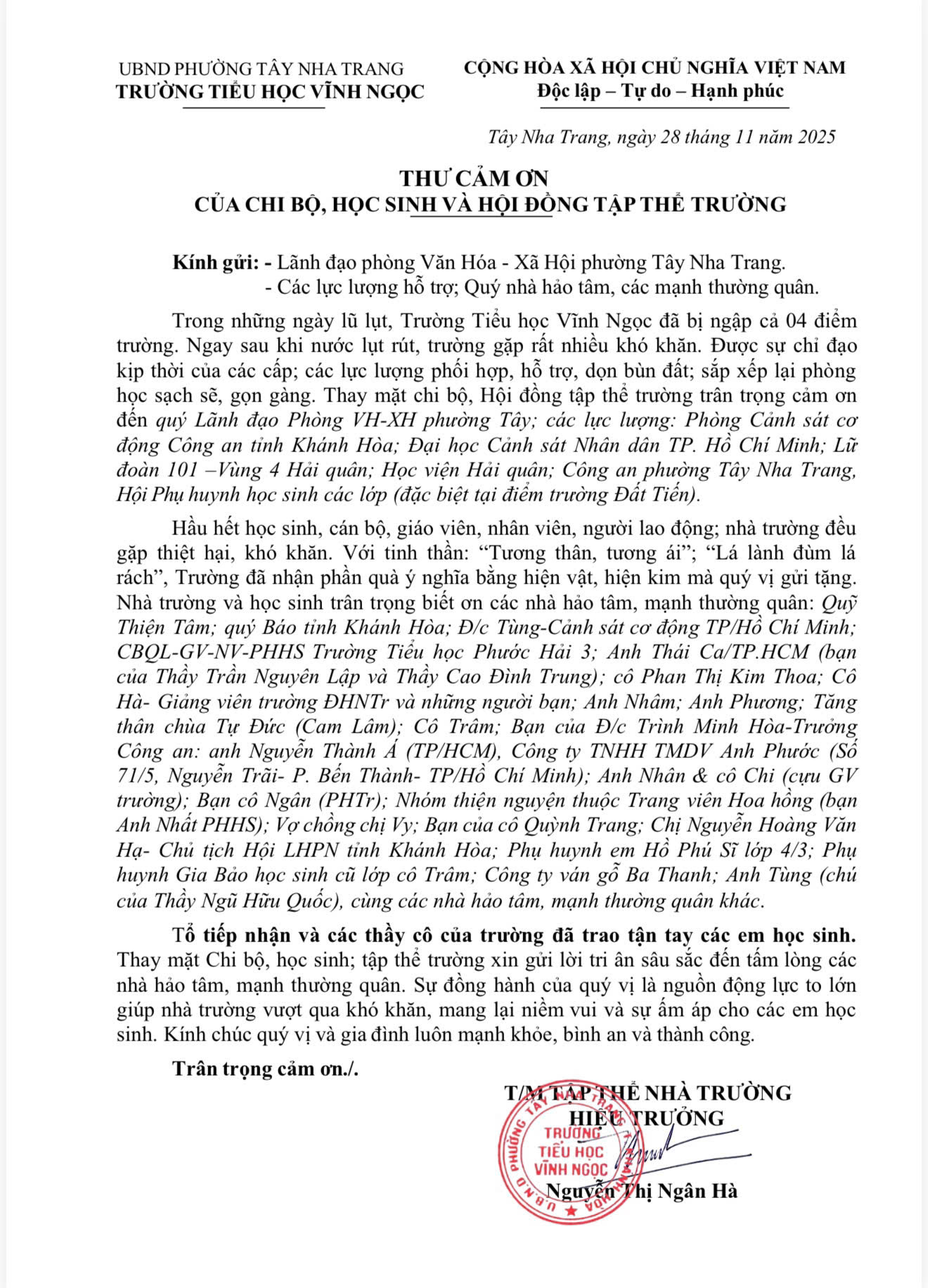 Thư cảm ơn của Chi bộ, học sinh và Hội đồng tập thể nhà trường (Lần 2)