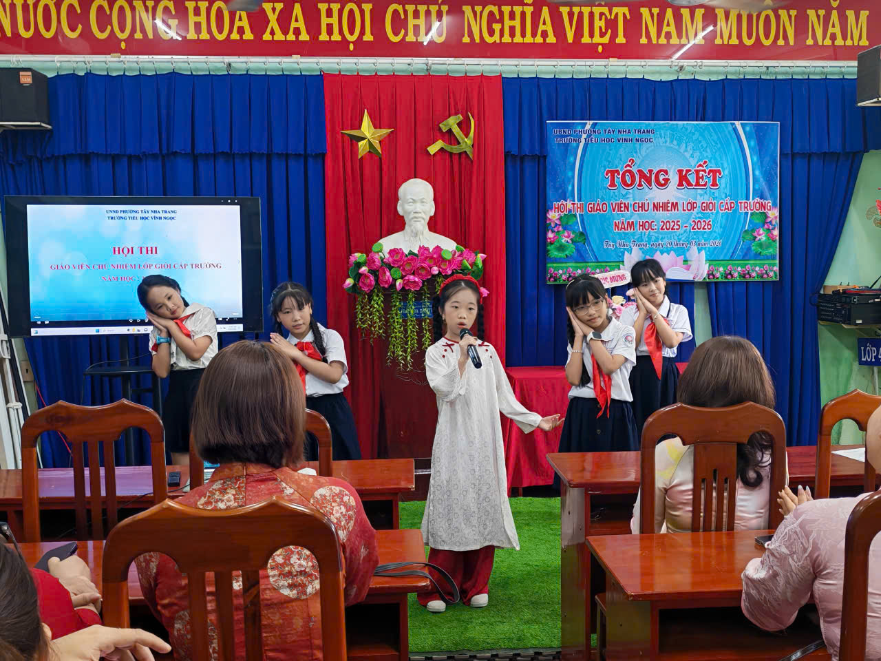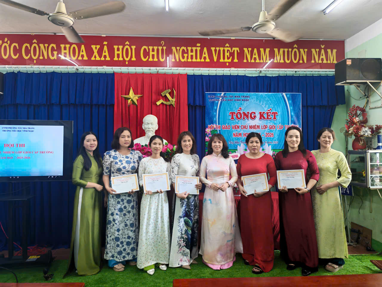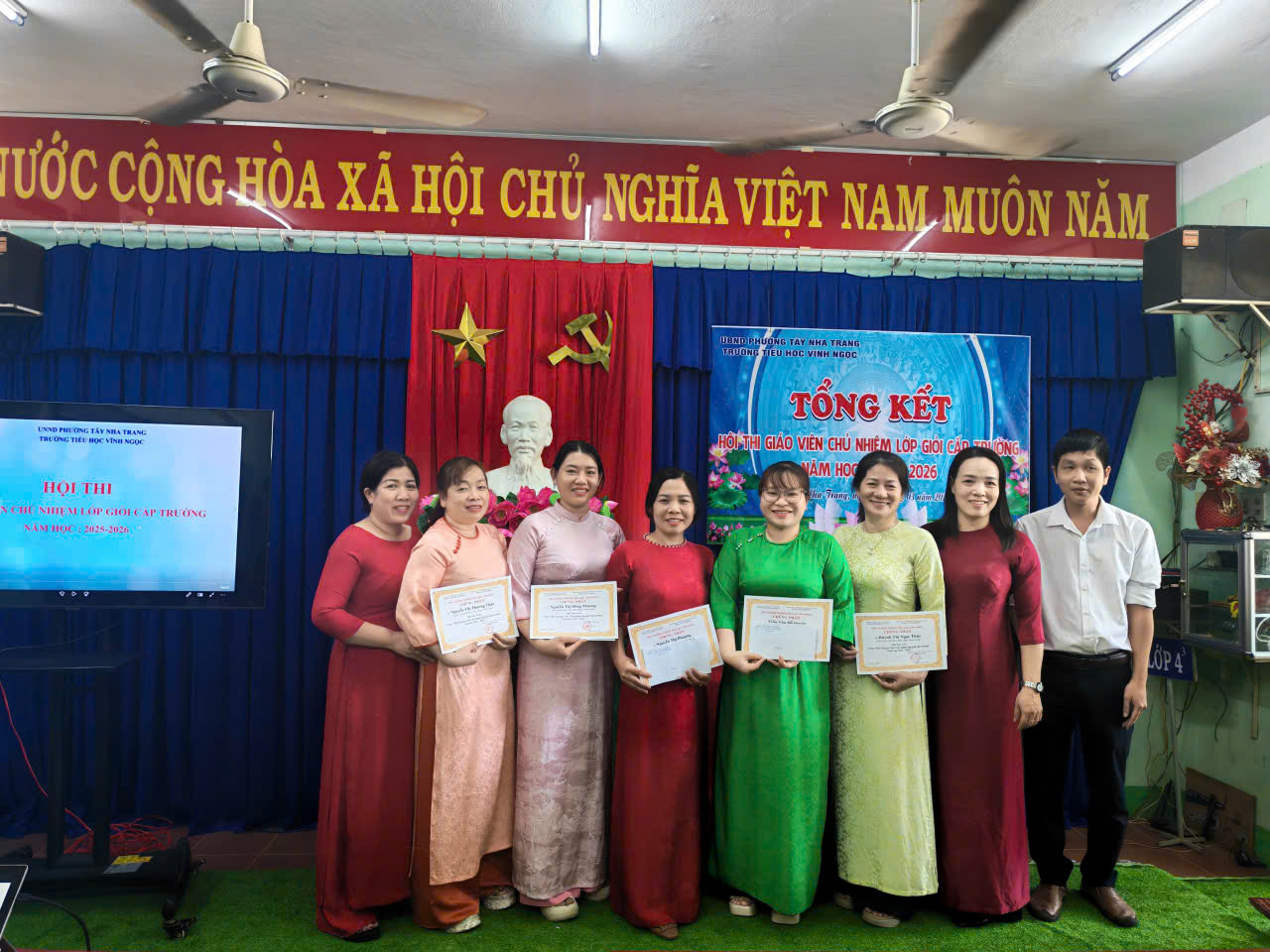 Sáng ngày 20/3/2026, Trường Tiểu học Vĩnh Ngọc đã long trọng tổ chức buổi tổng kết Hội thi trên. Hội thi được triển khai nhằm tạo điều kiện để đội ngũ giáo viên chủ nhiệm thể hiện năng lực chuyên môn, kỹ năng tổ chức lớp học và công tác giáo dục học sinh. Đồng thời, đây cũng là dịp để các thầy cô giao lưu, học hỏi kinh nghiệm, nâng cao chất lượng công tác chủ nhiệm trong nhà trường. Trong suốt quá trình diễn ra hội thi, Thầy cô đã tham gia đầy đủ các nội dung theo quy định, với tinh thần nghiêm túc, trách nhiệm. Nhiều tiết dạy và phần thể hiện công tác chủ nhiệm được chuẩn bị công phu, sáng tạo, bám sát thực tế, thể hiện rõ tâm huyết và sự tận tụy với học sinh. Tại buổi tổng kết, Ban tổ chức đã đánh giá cao sự nỗ lực của các thầy cô giáo tham gia dự thi, đồng thời tiến hành trao giấy khen và phần thưởng cho các giáo viên chủ nhiệm đạt thành tích. Hội thi khép lại thành công tốt đẹp, góp phần thúc đẩy phong trào thi đua dạy tốt – chủ nhiệm tốt trong toàn trường, hướng tới mục tiêu nâng cao chất lượng giáo dục toàn diện trong năm học 2025 – 2026. Sau đây là số hình ảnh hoạt động: