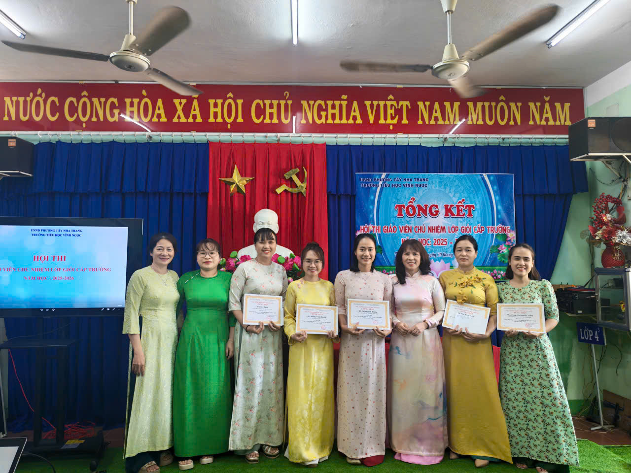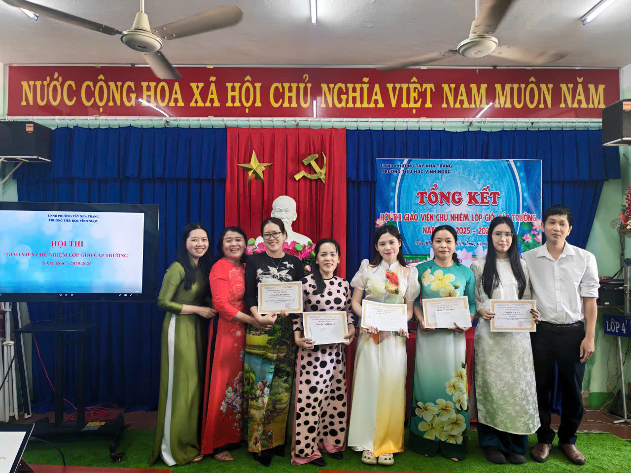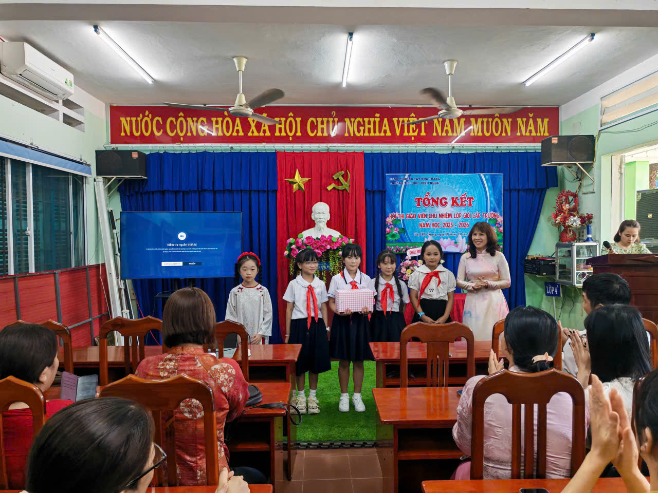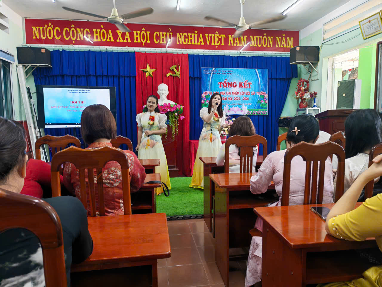 Sáng ngày 20/3/2026, Trường Tiểu học Vĩnh Ngọc đã long trọng tổ chức buổi tổng kết Hội thi trên. Hội thi được triển khai nhằm tạo điều kiện để đội ngũ giáo viên chủ nhiệm thể hiện năng lực chuyên môn, kỹ năng tổ chức lớp học và công tác giáo dục học sinh. Đồng thời, đây cũng là dịp để các thầy cô giao lưu, học hỏi kinh nghiệm, nâng cao chất lượng công tác chủ nhiệm trong nhà trường. Trong suốt quá trình diễn ra hội thi, Thầy cô đã tham gia đầy đủ các nội dung theo quy định, với tinh thần nghiêm túc, trách nhiệm. Nhiều tiết dạy và phần thể hiện công tác chủ nhiệm được chuẩn bị công phu, sáng tạo, bám sát thực tế, thể hiện rõ tâm huyết và sự tận tụy với học sinh. Tại buổi tổng kết, Ban tổ chức đã đánh giá cao sự nỗ lực của các thầy cô giáo tham gia dự thi, đồng thời tiến hành trao giấy khen và phần thưởng cho các giáo viên chủ nhiệm đạt thành tích. Hội thi khép lại thành công tốt đẹp, góp phần thúc đẩy phong trào thi đua dạy tốt – chủ nhiệm tốt trong toàn trường, hướng tới mục tiêu nâng cao chất lượng giáo dục toàn diện trong năm học 2025 – 2026. Sau đây là số hình ảnh hoạt động: